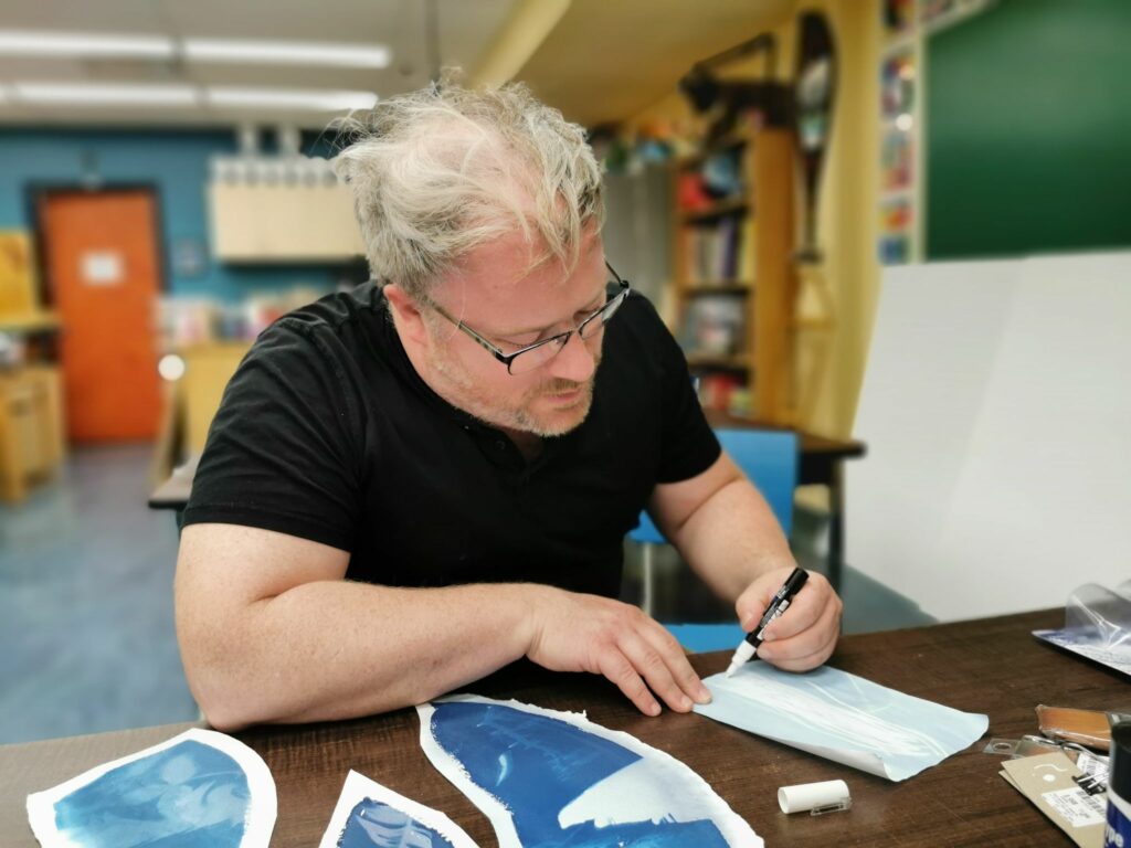 Sous l’exposition au soleil, le fer des surfaces exposées est réduit et forme la couleur bleue. N’importe quel type d’objet peut aussi être utilisé pour obtenir des photogrammes. Ce qui est le cas ici dans le projet avec les élèves: ”Kanitau-unaitshesht. Hommage au trappeur supérieur”.